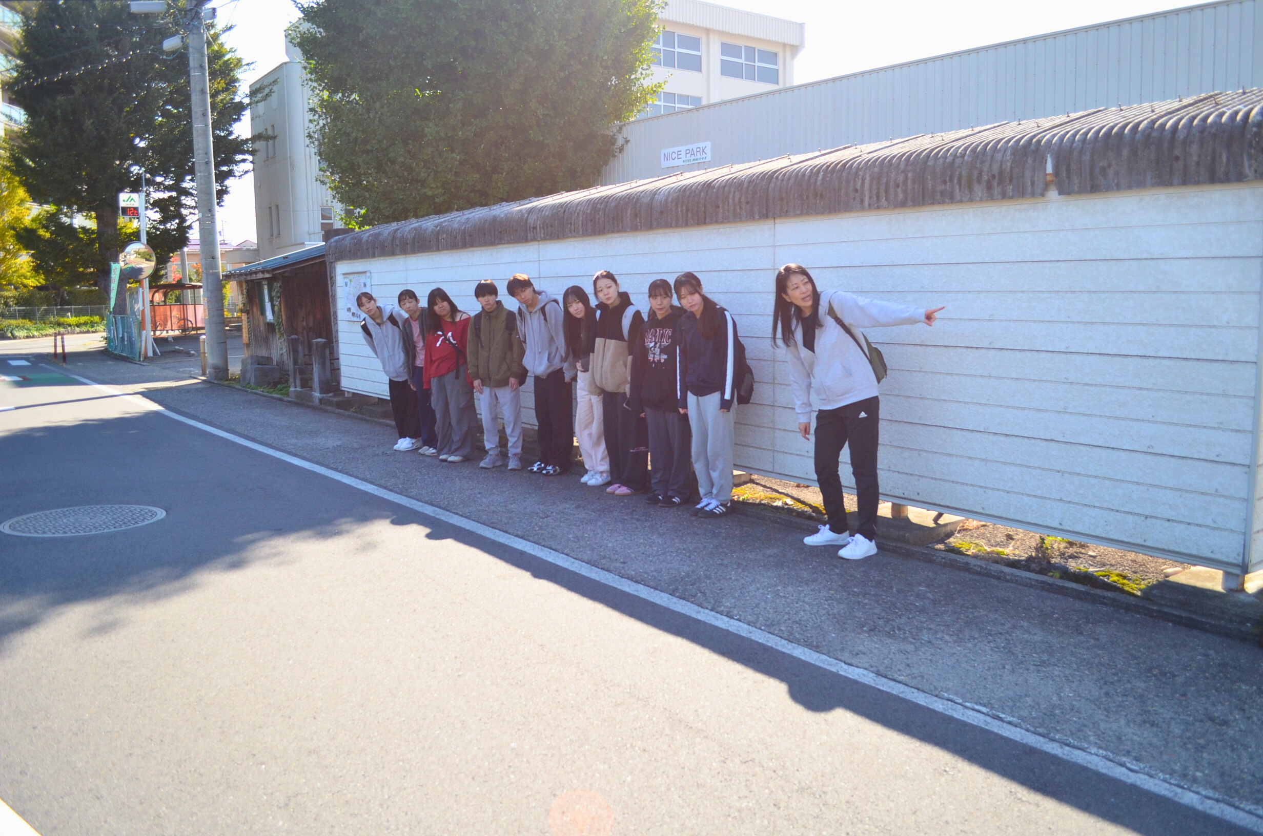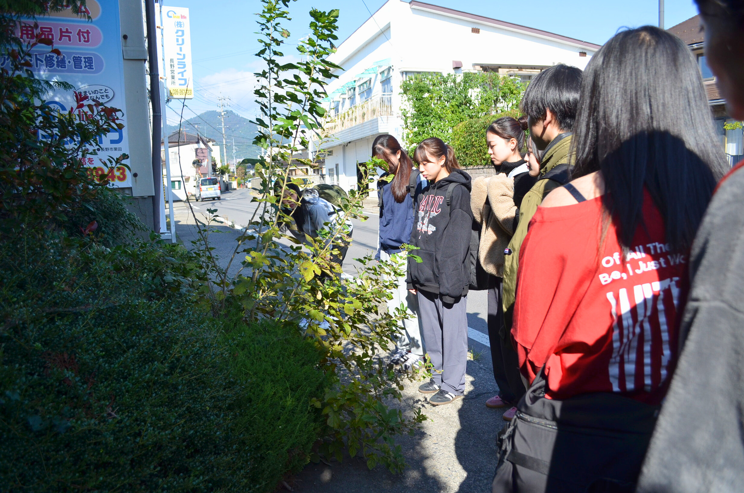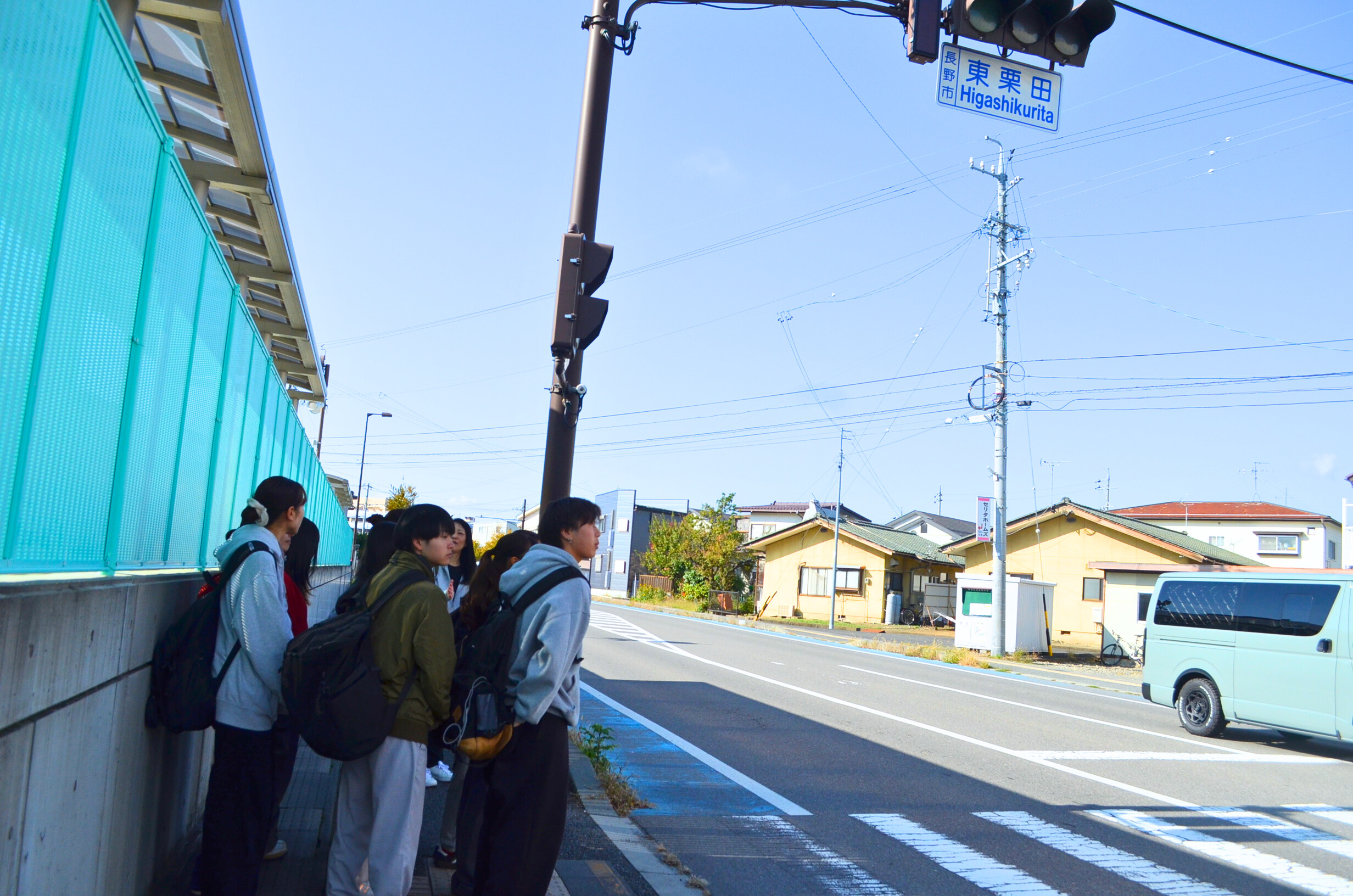 学生達が通学でよく使用する道路ですが、「保育者として子どもと一緒に歩く」といった視点で実際に歩いてみると、たくさんの学びがありました。