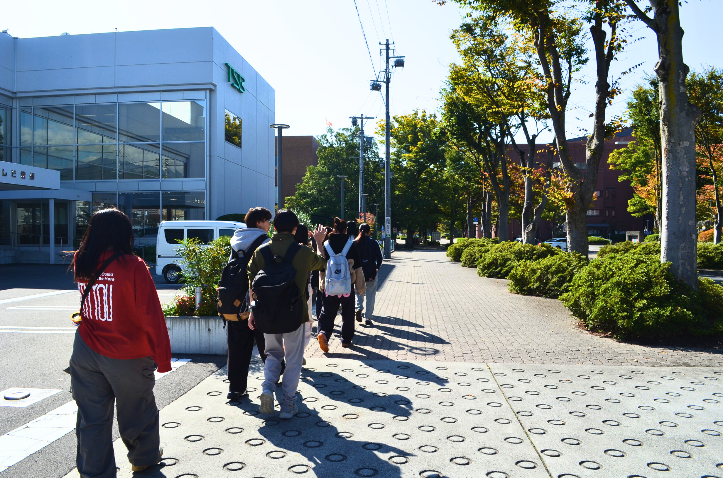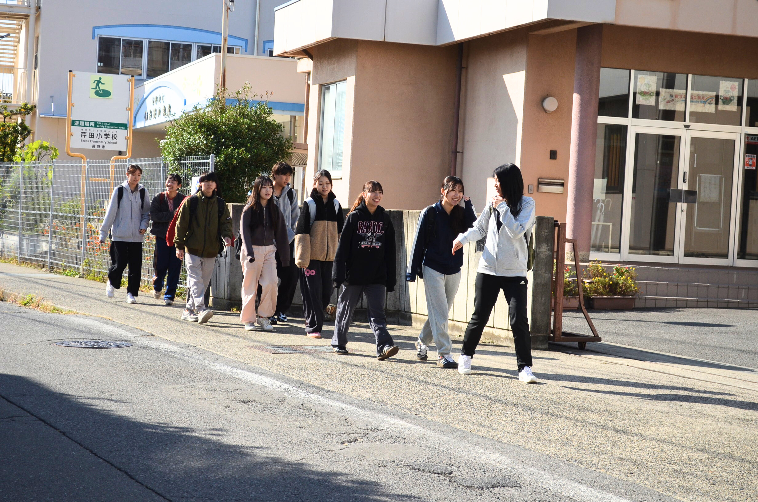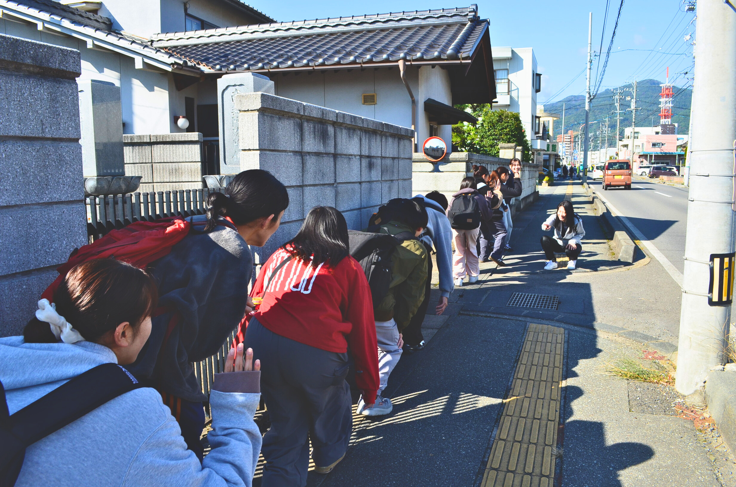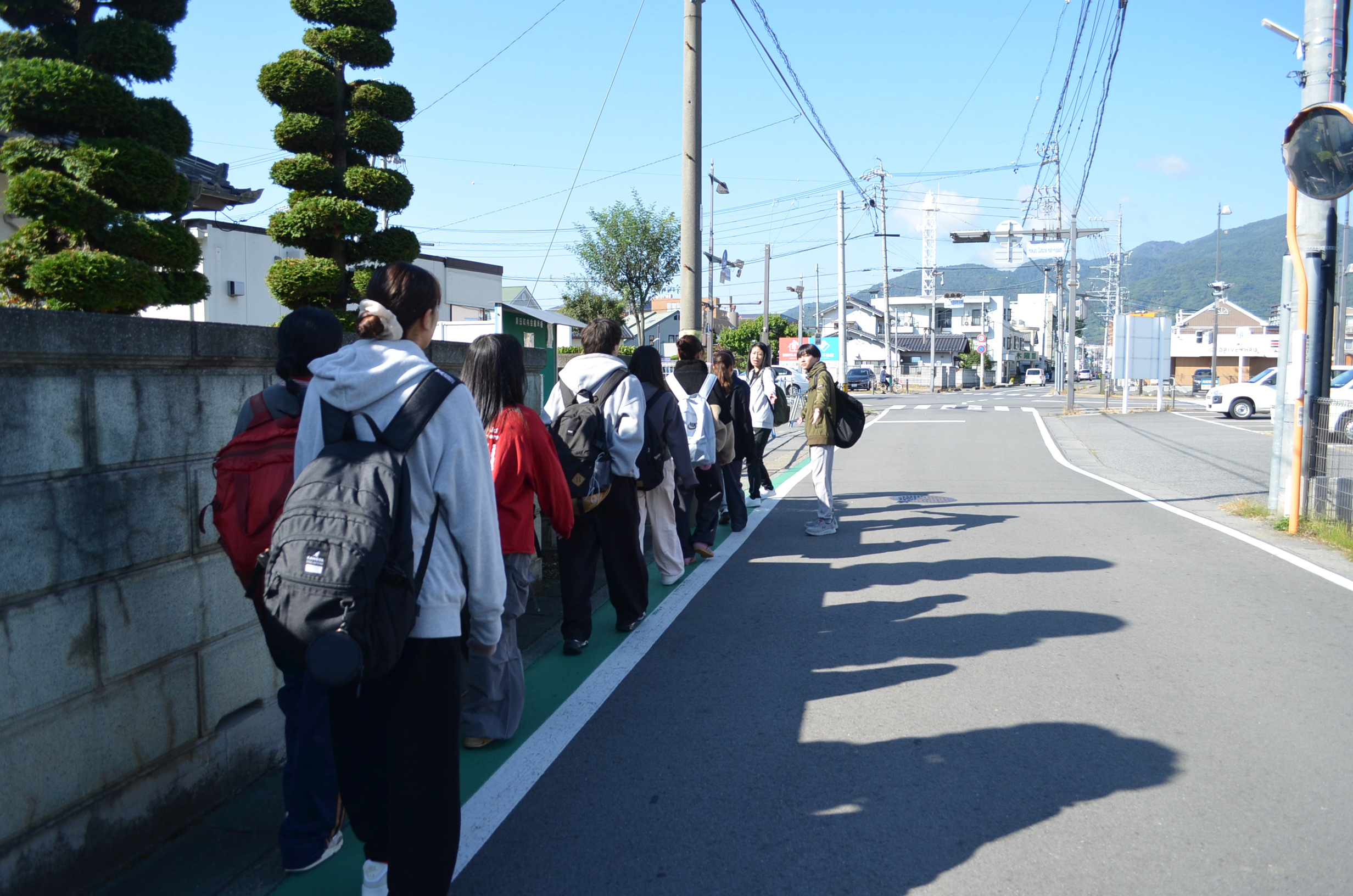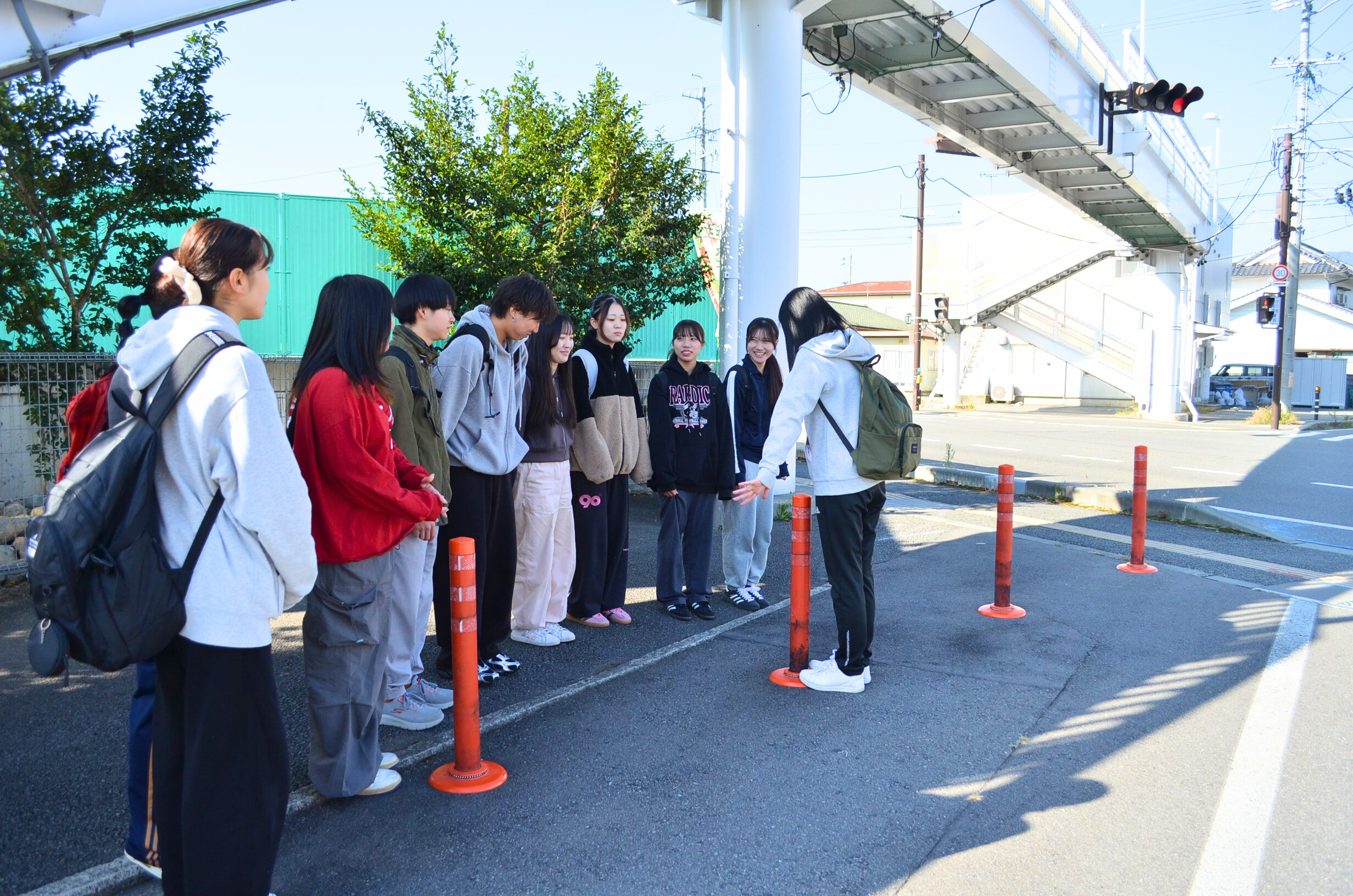 この授業では、道の歩き方や子どもの誘導方法、事故や事件が起こらないための配慮について、実際に学校から若里公園まで歩きながら学びます。