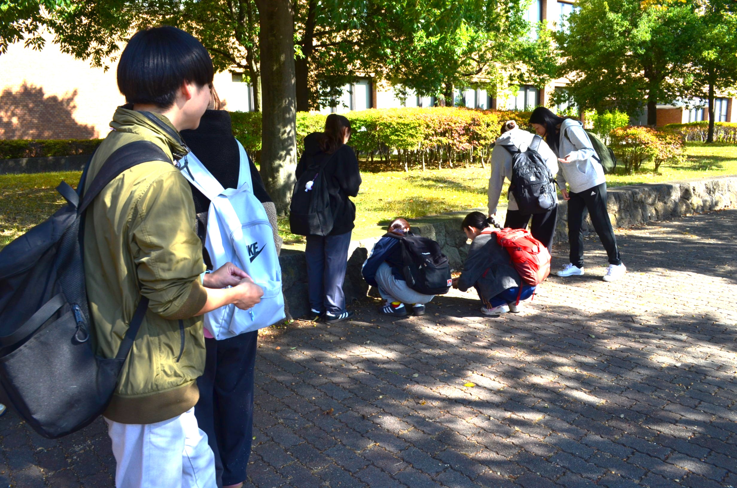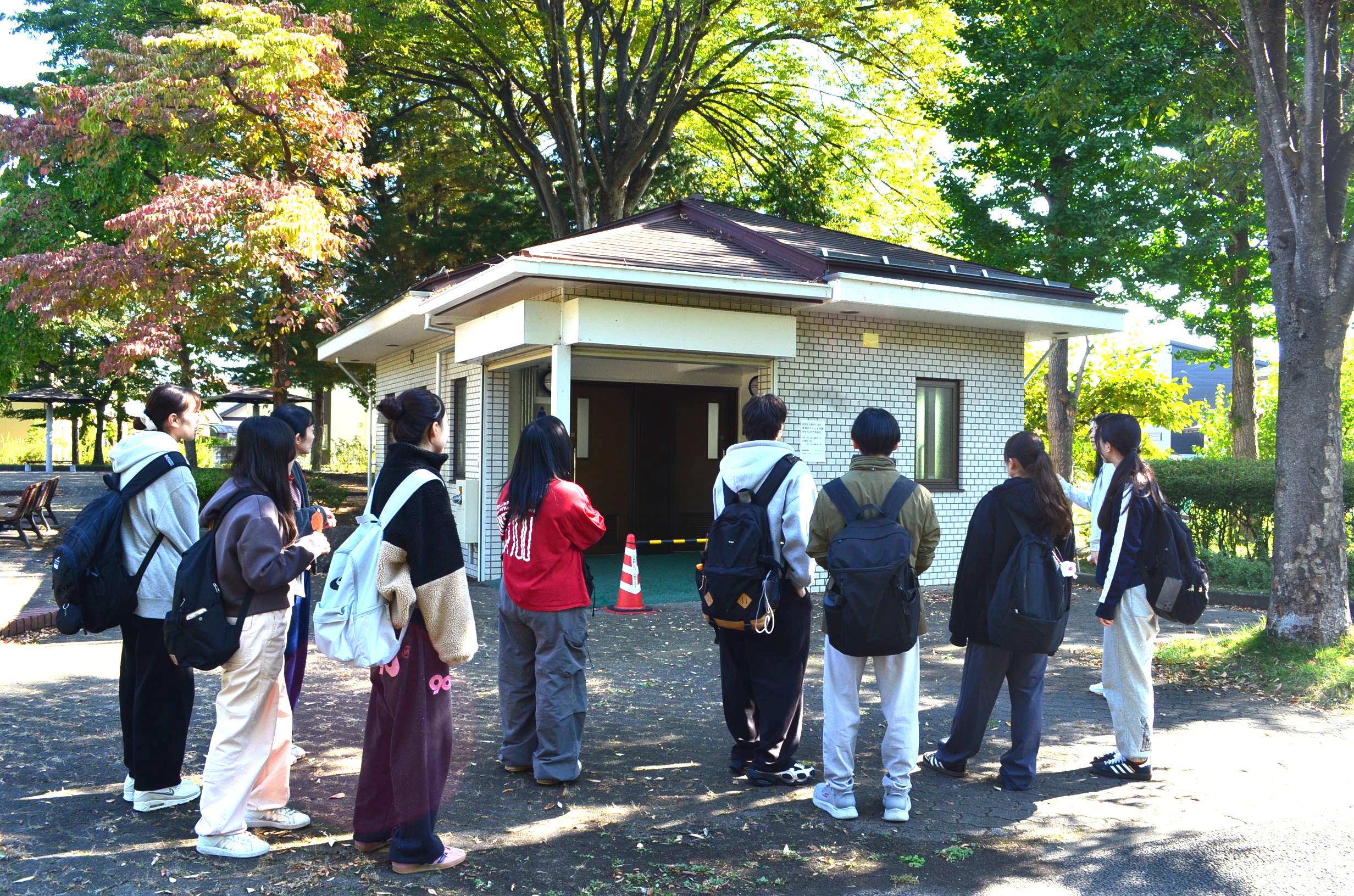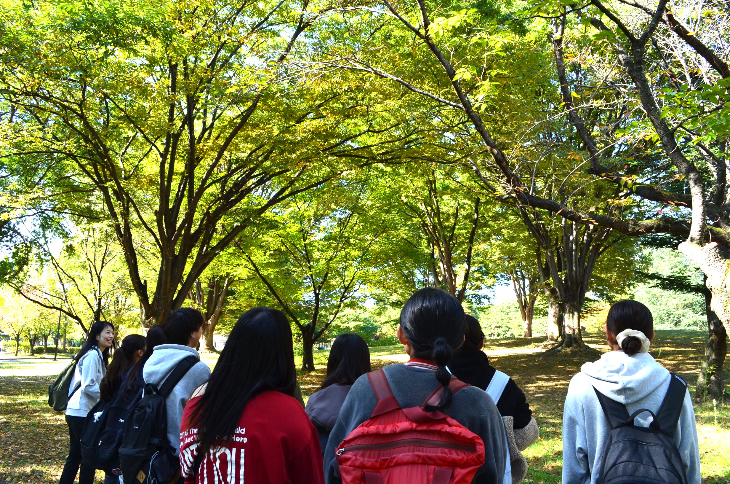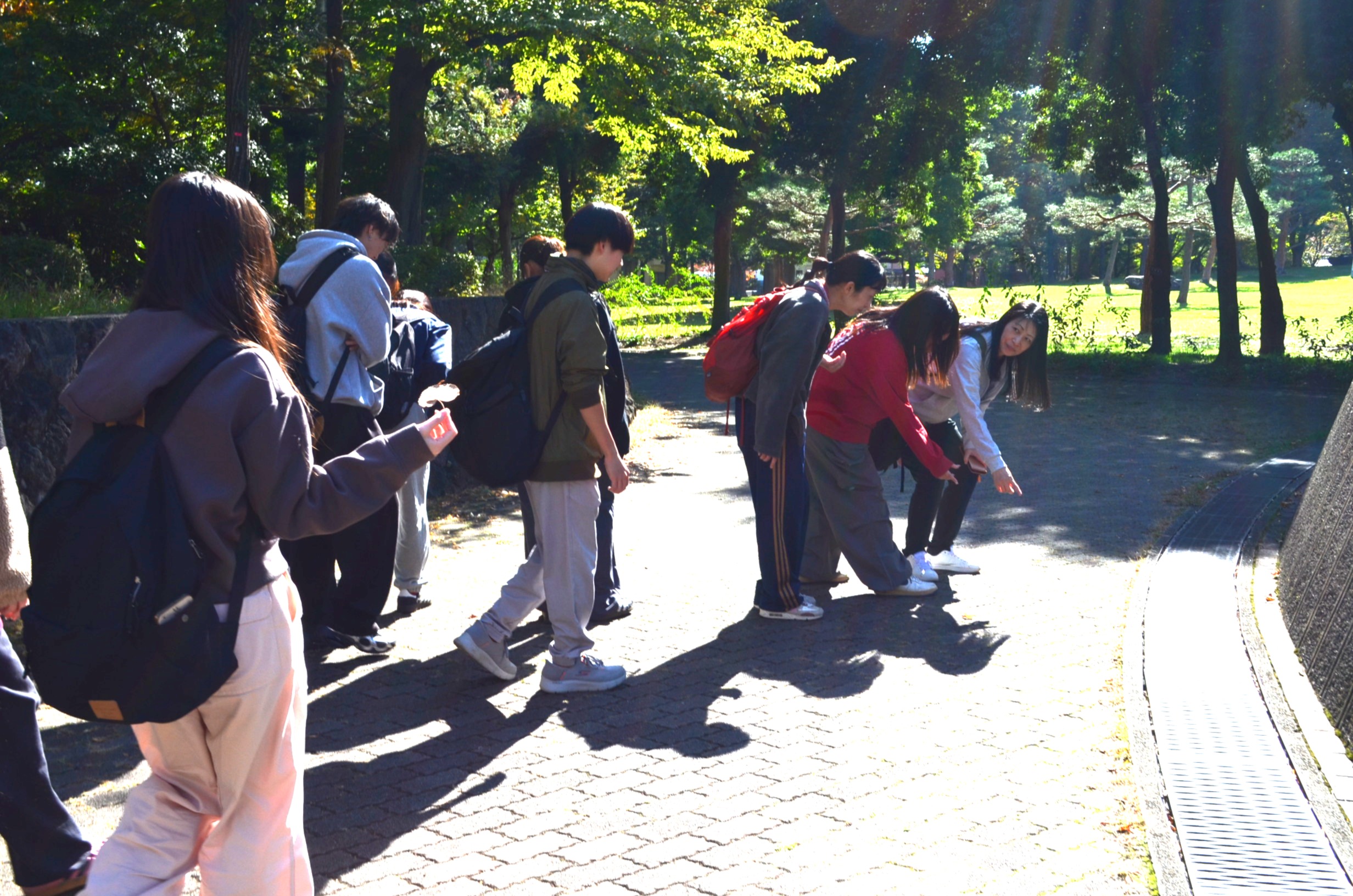道の歩き方や子どもの誘導方法を学びながら若里公園に到着した学生達。続いて、公園内で事故や事件が起こらないための配慮について、実際に公園を散策しながら学びました。