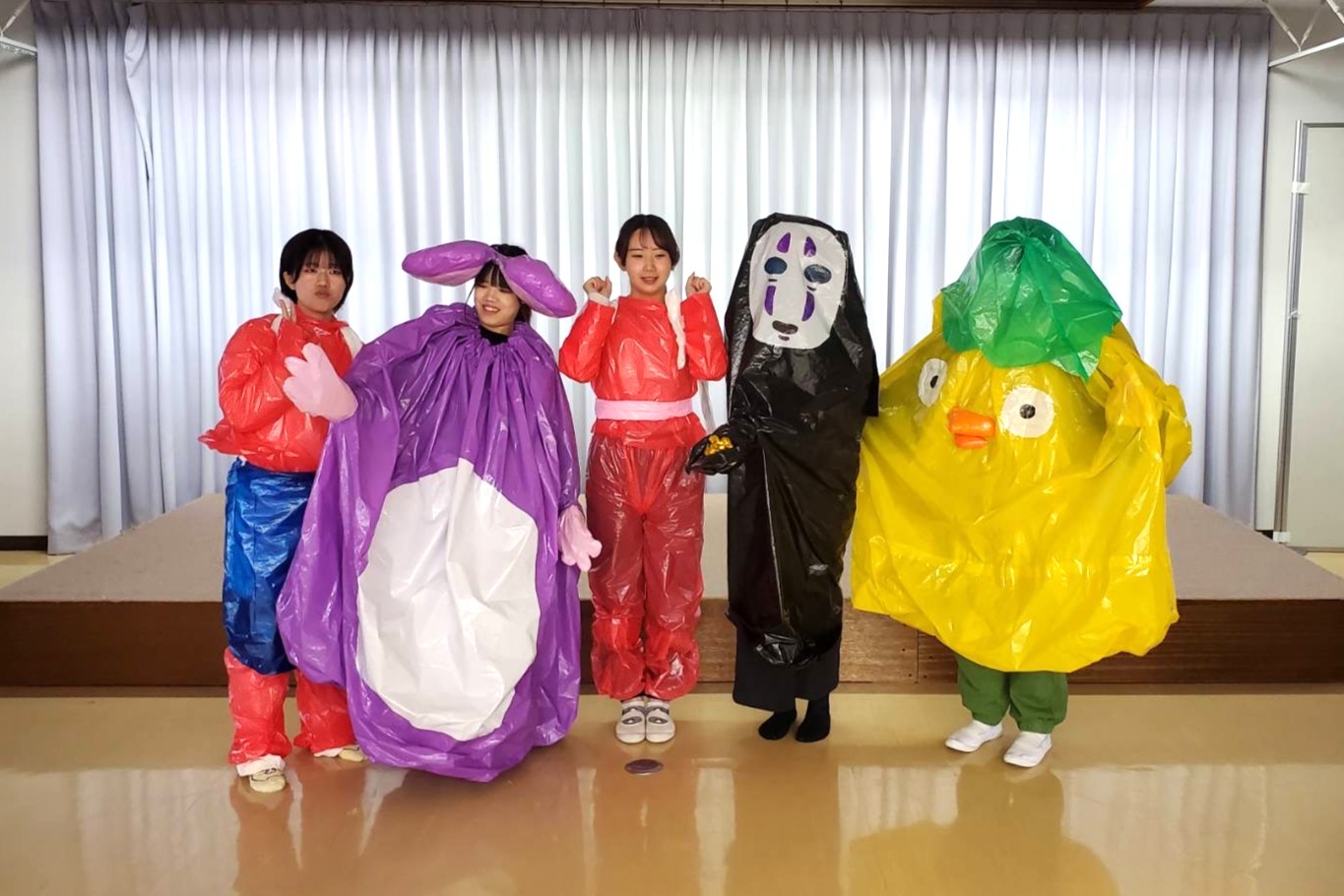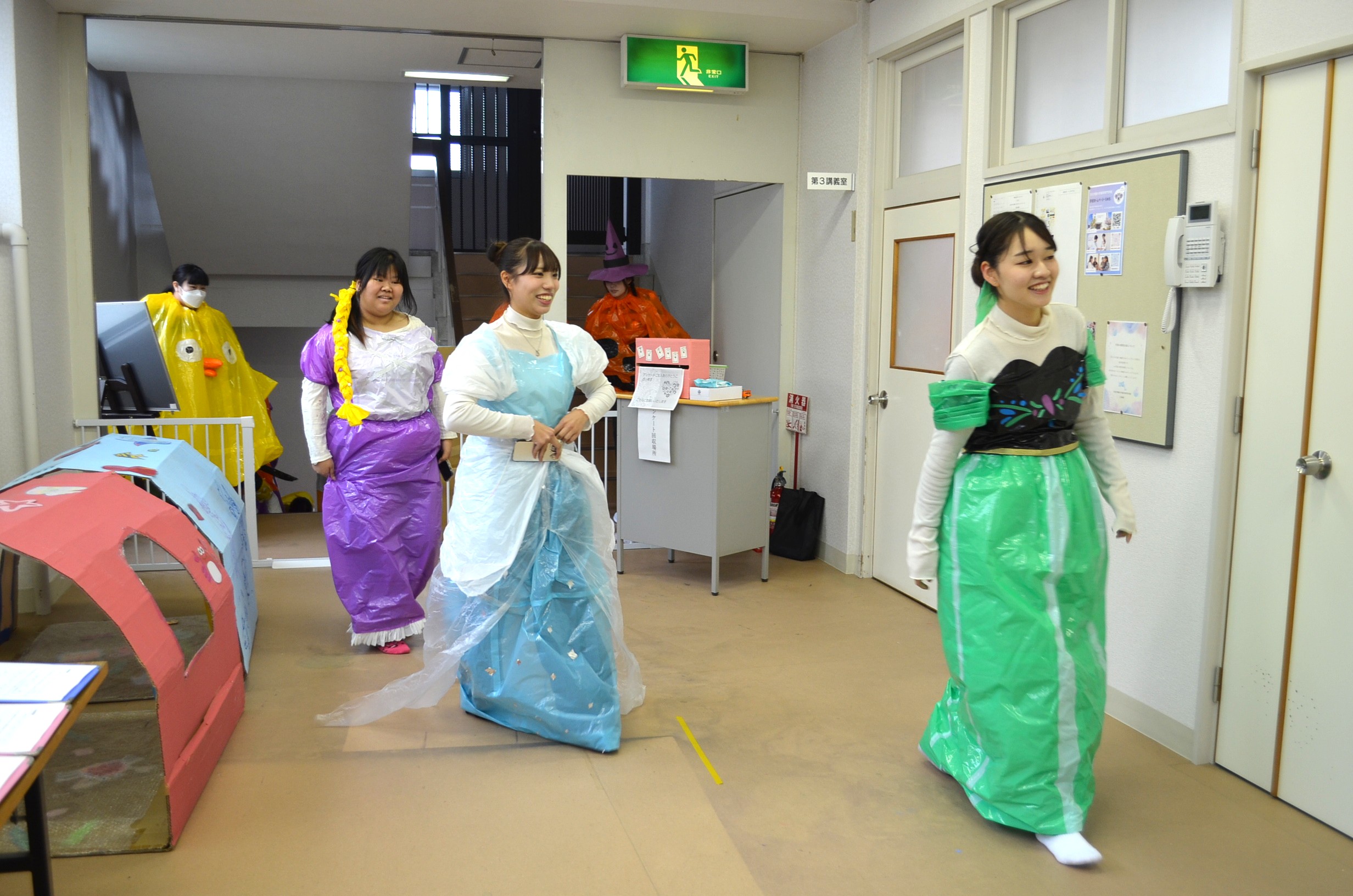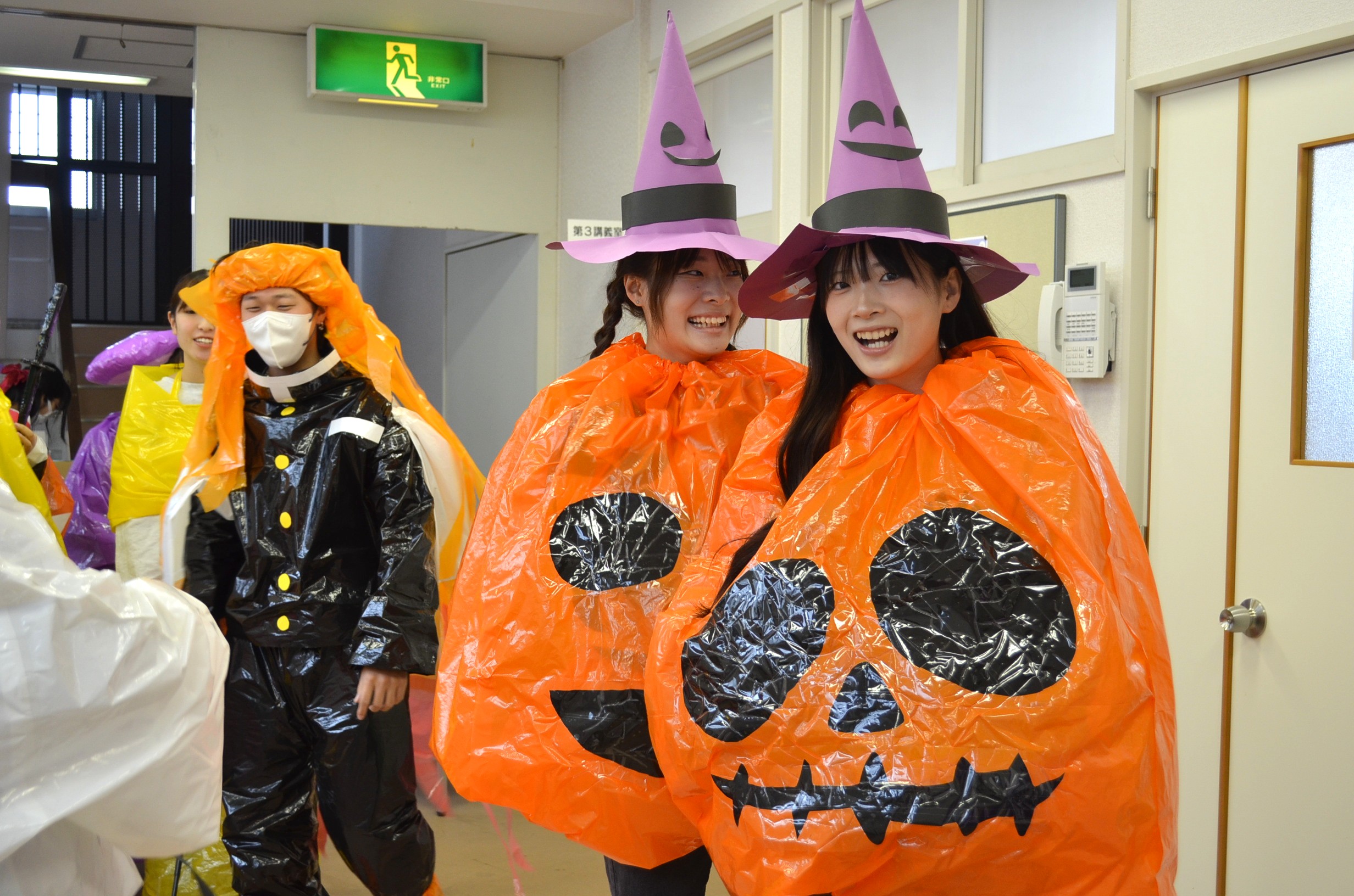 2年先の「遊びと造形」の授業で、カラーポリ袋を使ったハロウィン衣装の作成を行いました。