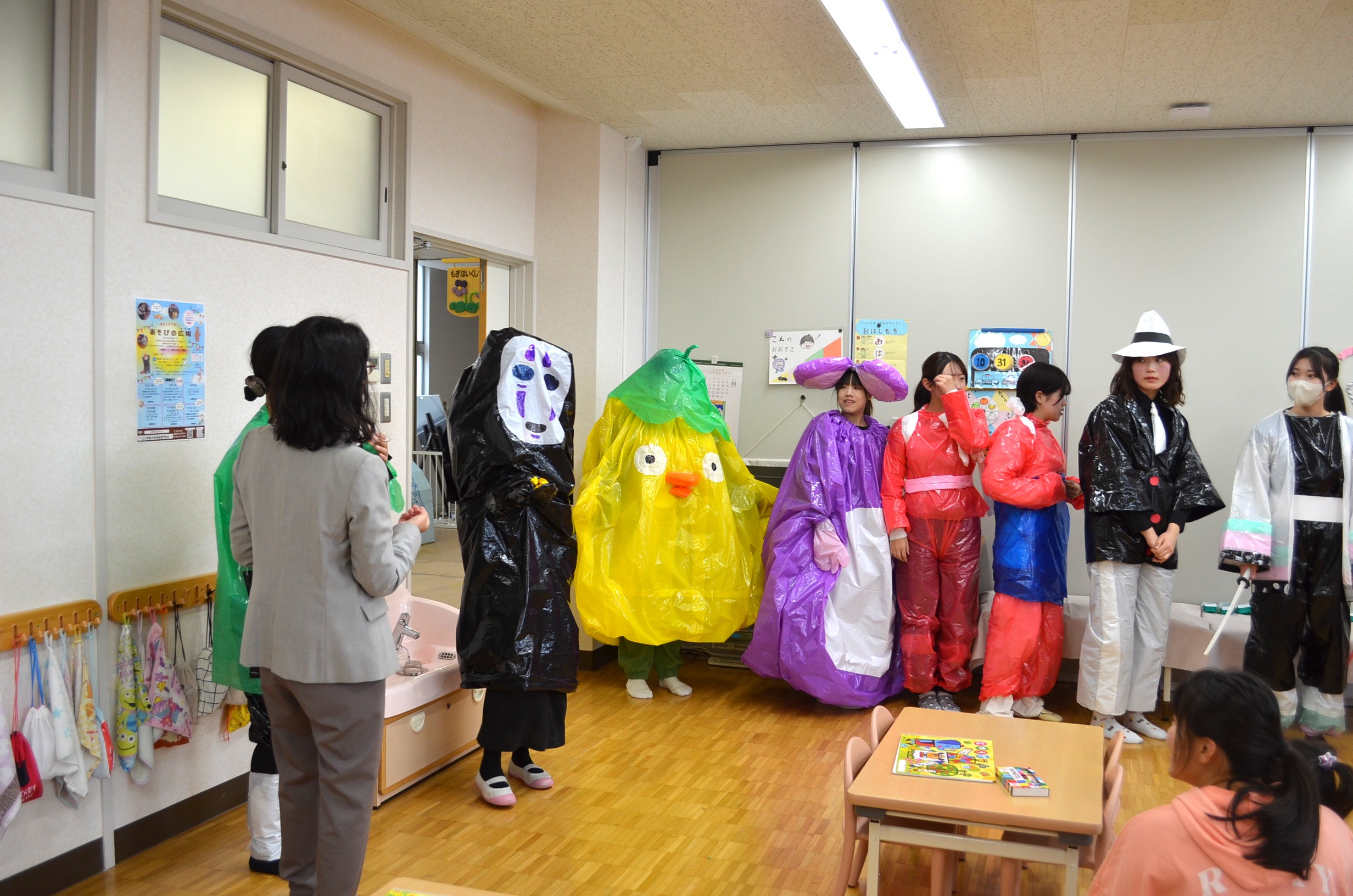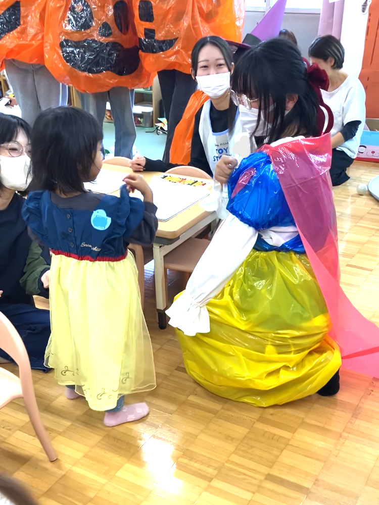 3歳児以上の園児さんに合わせての衣装だったため、あそびの広場に参加する小さなお子さん達は少し怖がってしまう姿もありましたが・・・
