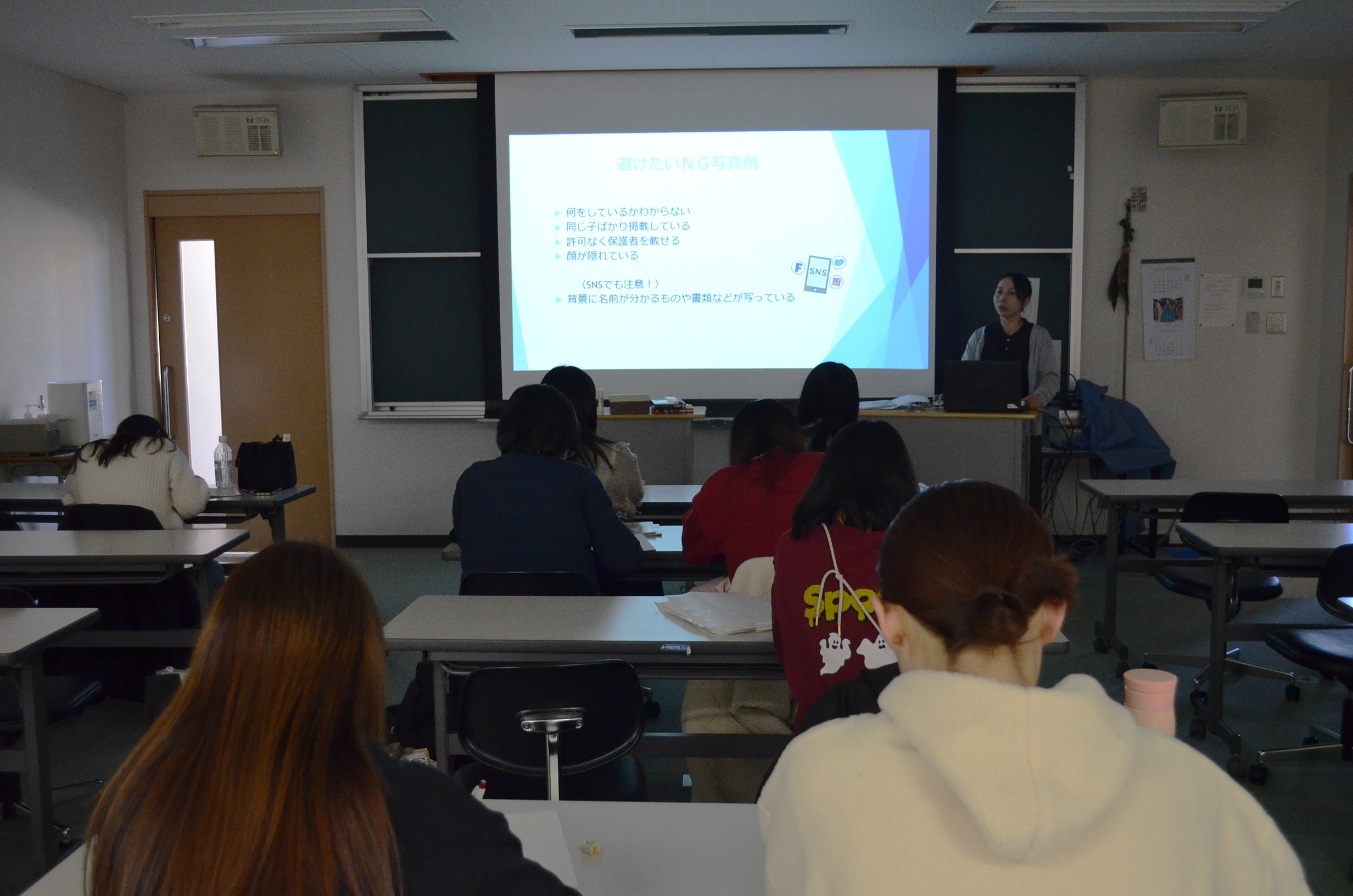 まず、園だよりにも使用される写真の撮影について、保護者に子どものどんな姿を伝えたいのか、その意図が伝わるためにどう撮影すると効果的なのかなど、実際の保育現場を想定しながら撮影のテクニックについて教わりました。また、現在SNSやブログを運用している施設も多くあるため、ネットリテラシーについても確認し合いました。
