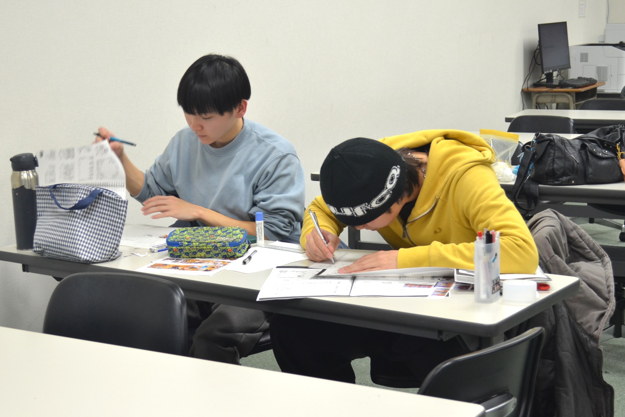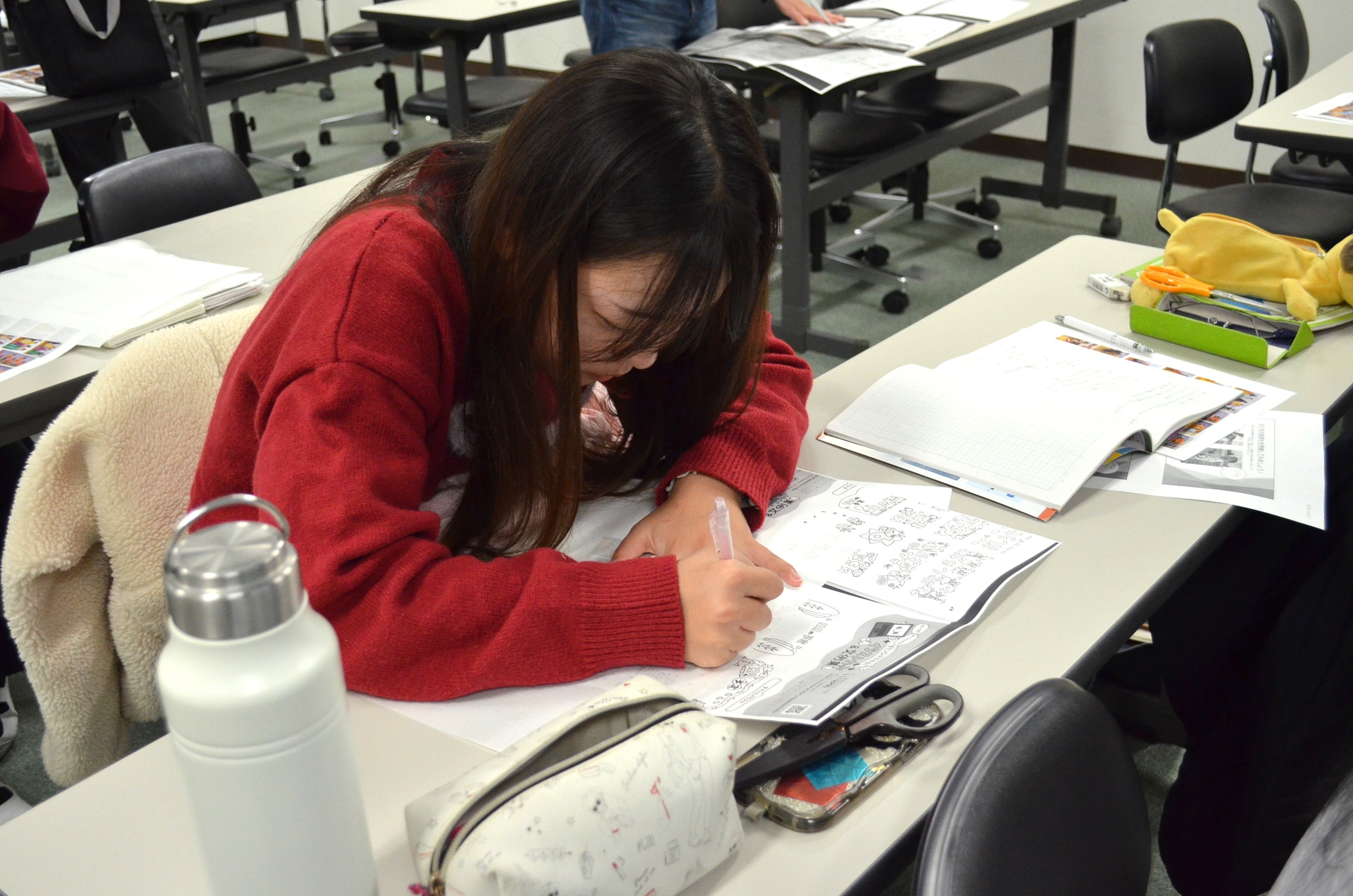 園だよりの作成では、イラストの転写方法や校正方法などを教わります。園だよりは多くの園で毎月発行されています。忙しい日々の中でいかに手際よく作成できるかも重要であることなど、現場経験がある教員からリアルなアドバイスを受け、時間も意識しながら集中して書きあげる学生の姿が見られました。