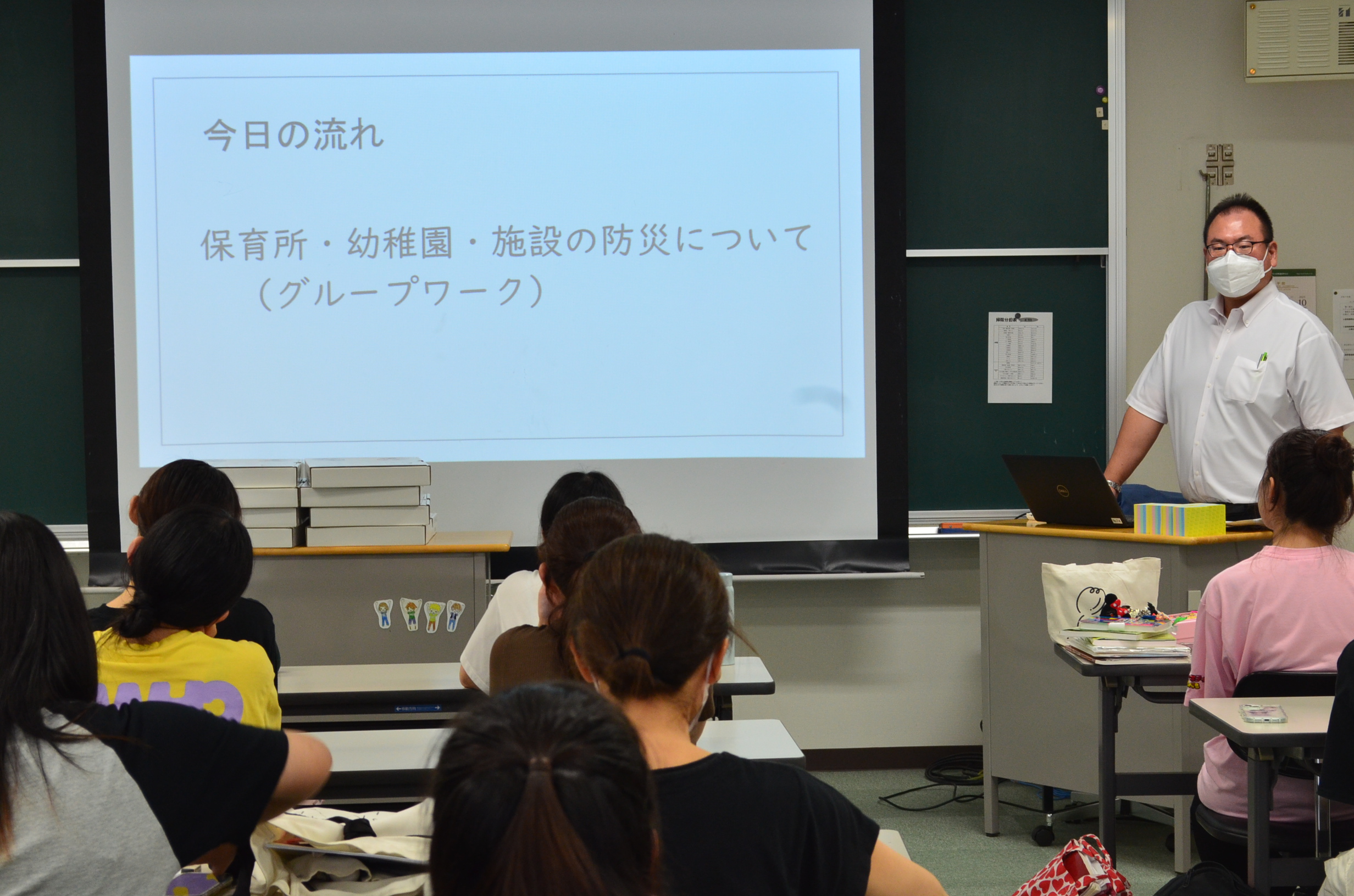2年生「保育内容指導法・環境」の授業で、保育所・幼稚園・施設等の防災についてグループワークを行いました。