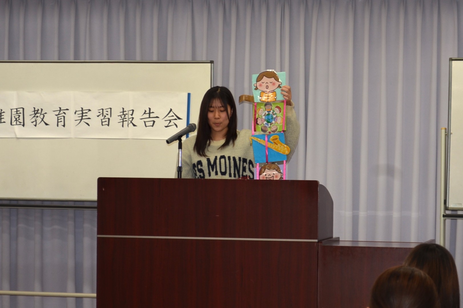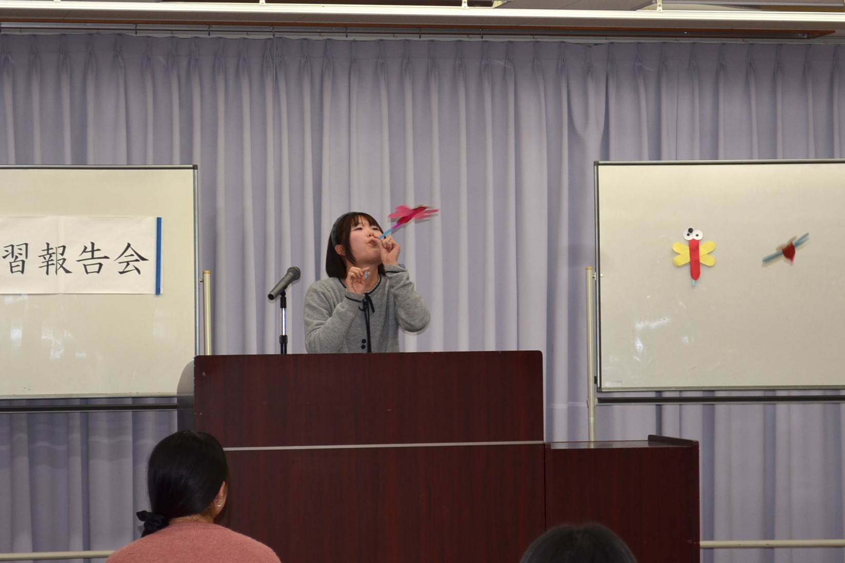 どんな活動をしたか、制作したものや視覚教材を実際に見せながら説明してくれました。ゲームあそびを再現してくれる学生もいました。印象に残った子ども達の姿や言葉、また子ども達との関わり方で先生方からご指導いただいた内容などの報告もありました。実習に真摯に向き合い、多くのことを学んできたことが感じられる報告内容がとても多かったです。