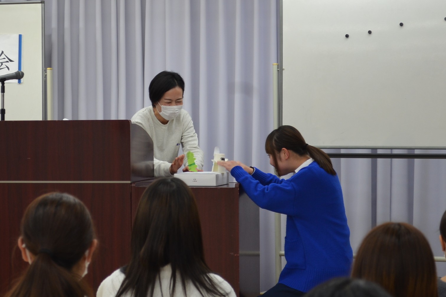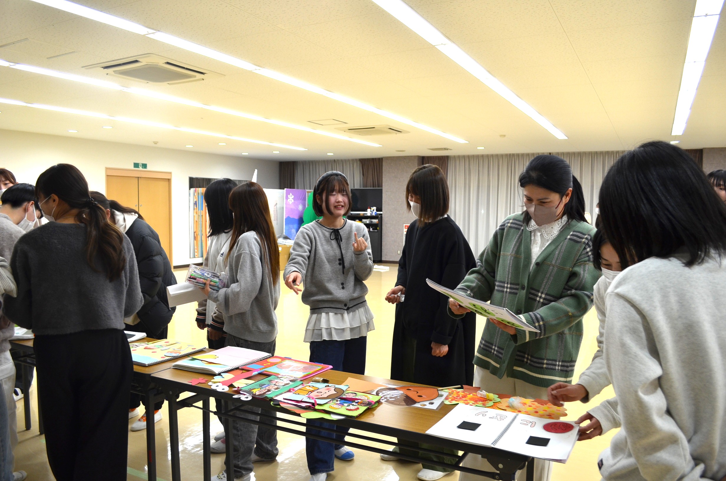 また、実習直前に行った保育会がとても参考になったと2年生にお礼を伝える1年生もいました。2年生からは1年生の頑張りを讃える感想が伝えられ、1年生の制作物を「就職後の参考になる!」を熱心に見たり、作り方を聞いたりしている姿がありました。まさに本校の支え合う学びを象徴するような時間となりました。