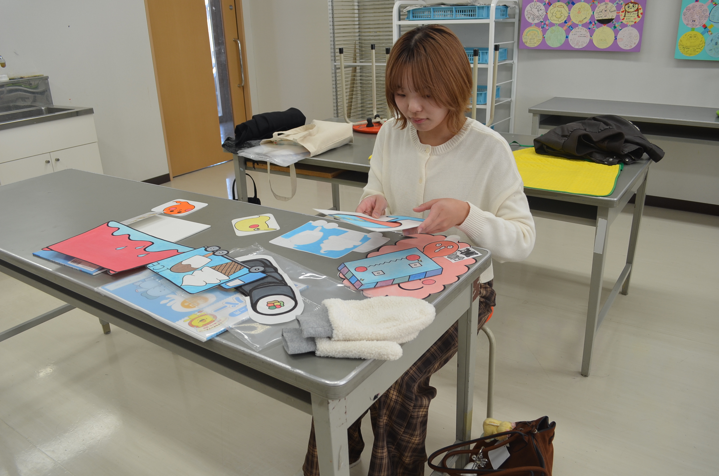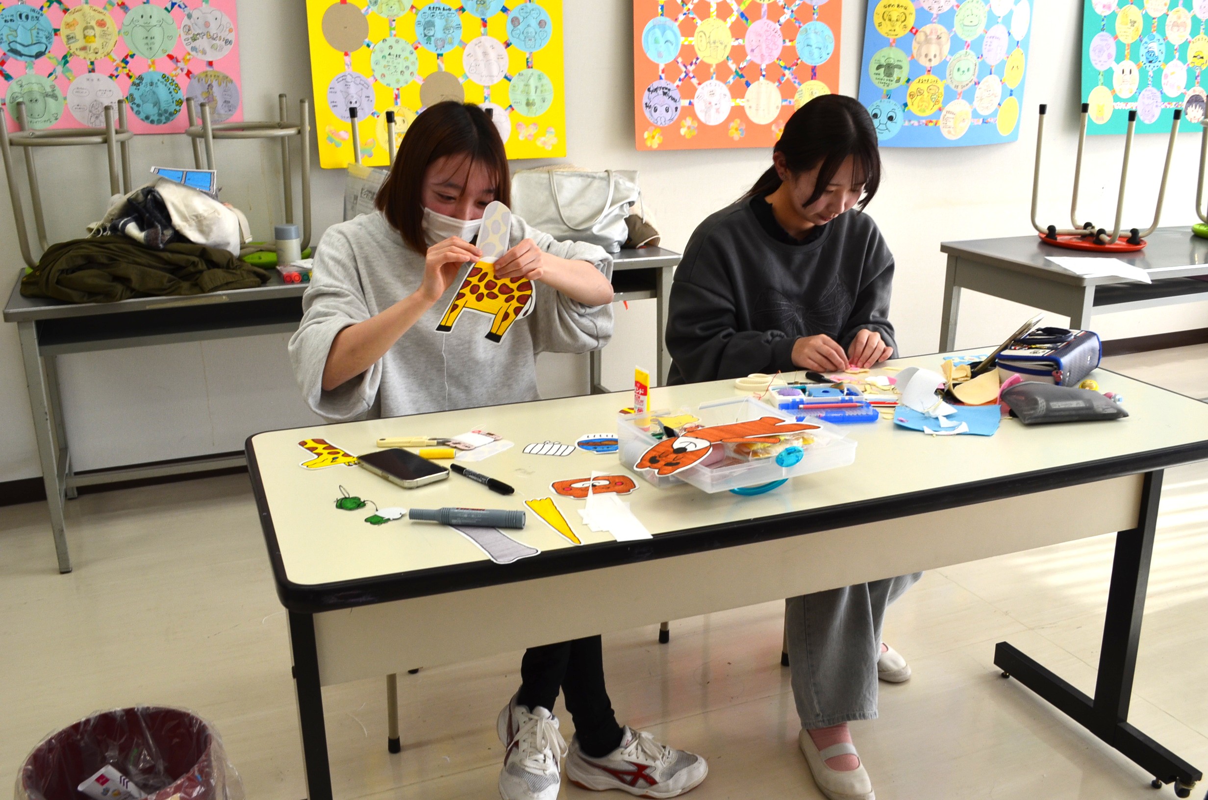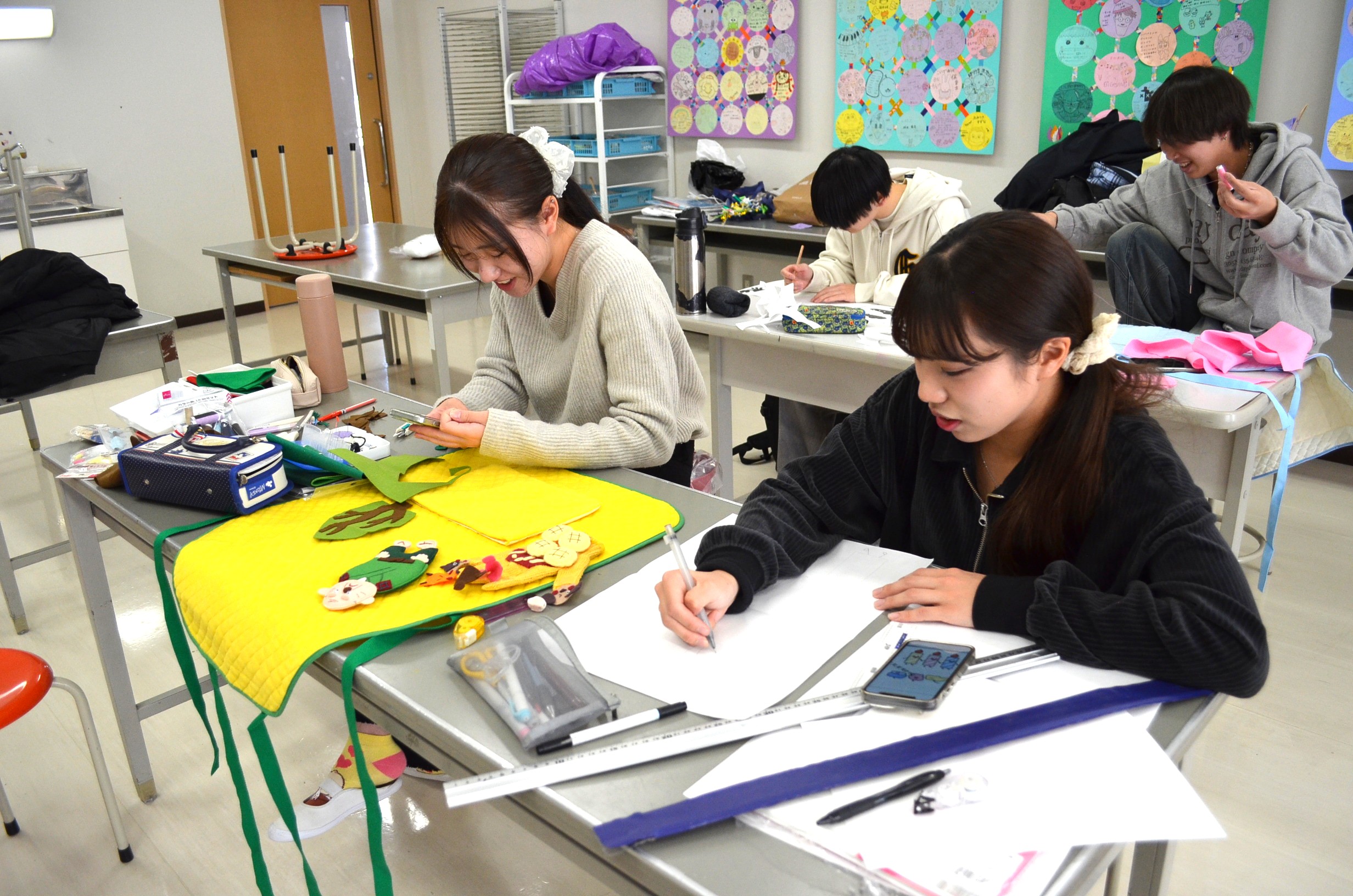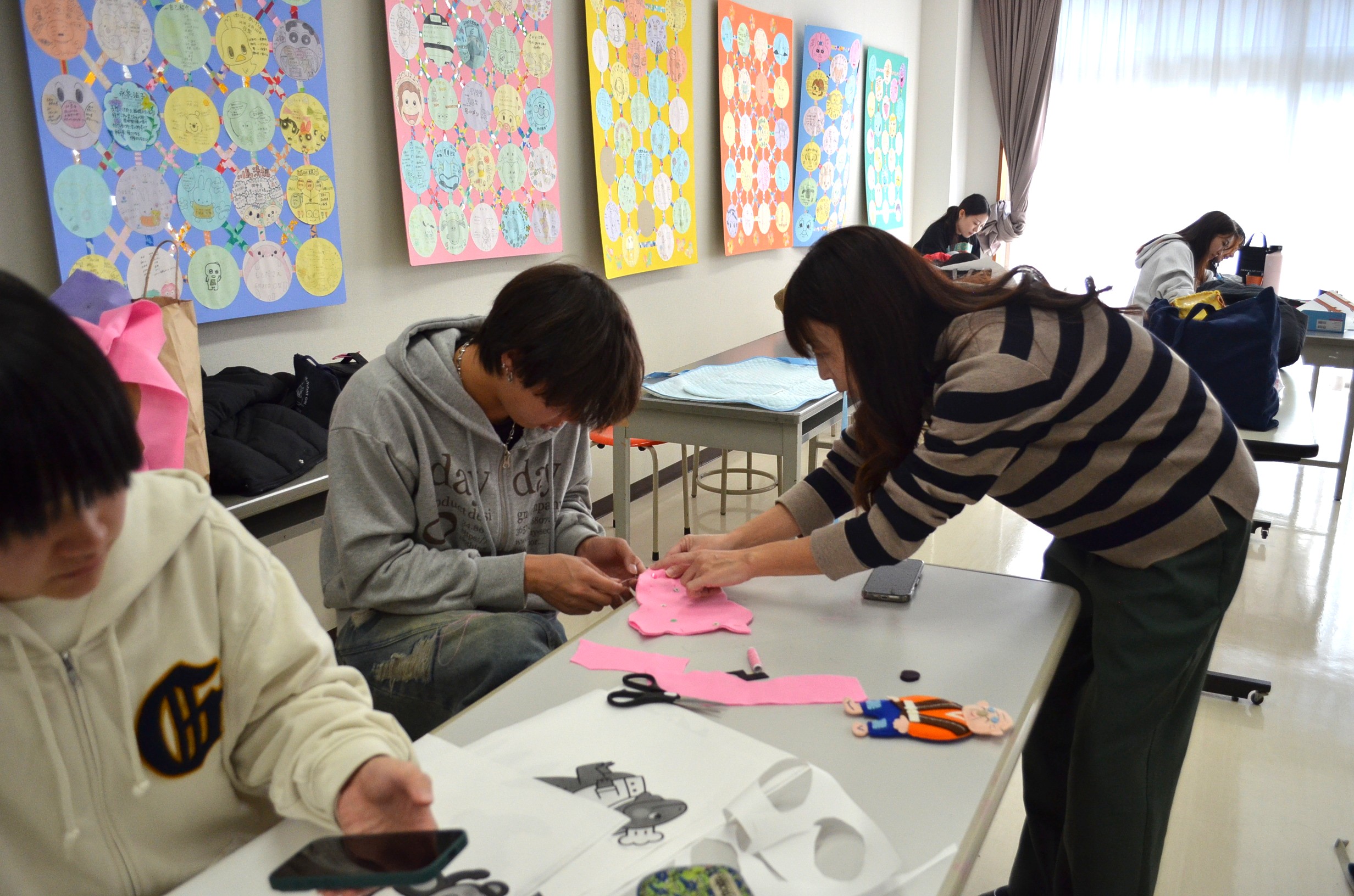 絵や縫い物の得意不得意も学生によって様々ですが、教員が一人ひとりにアドバイスをしたり、時には手助けもしながら楽しい雰囲気で制作していました。