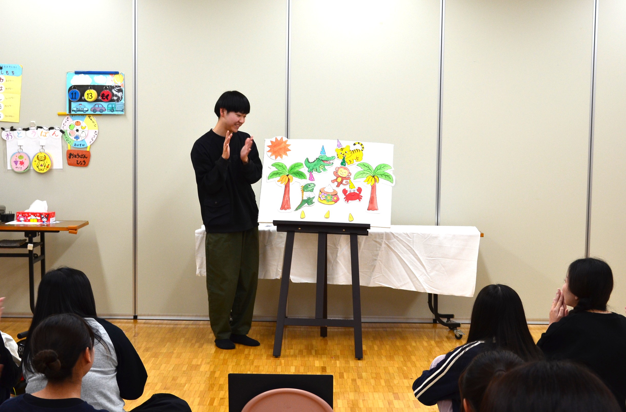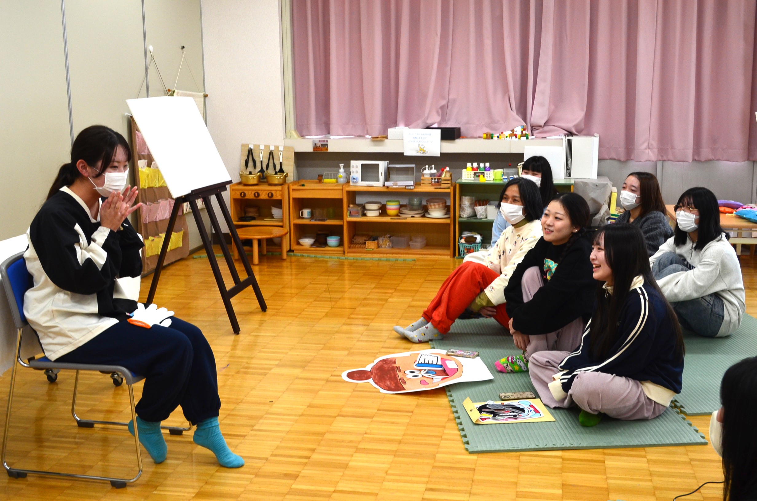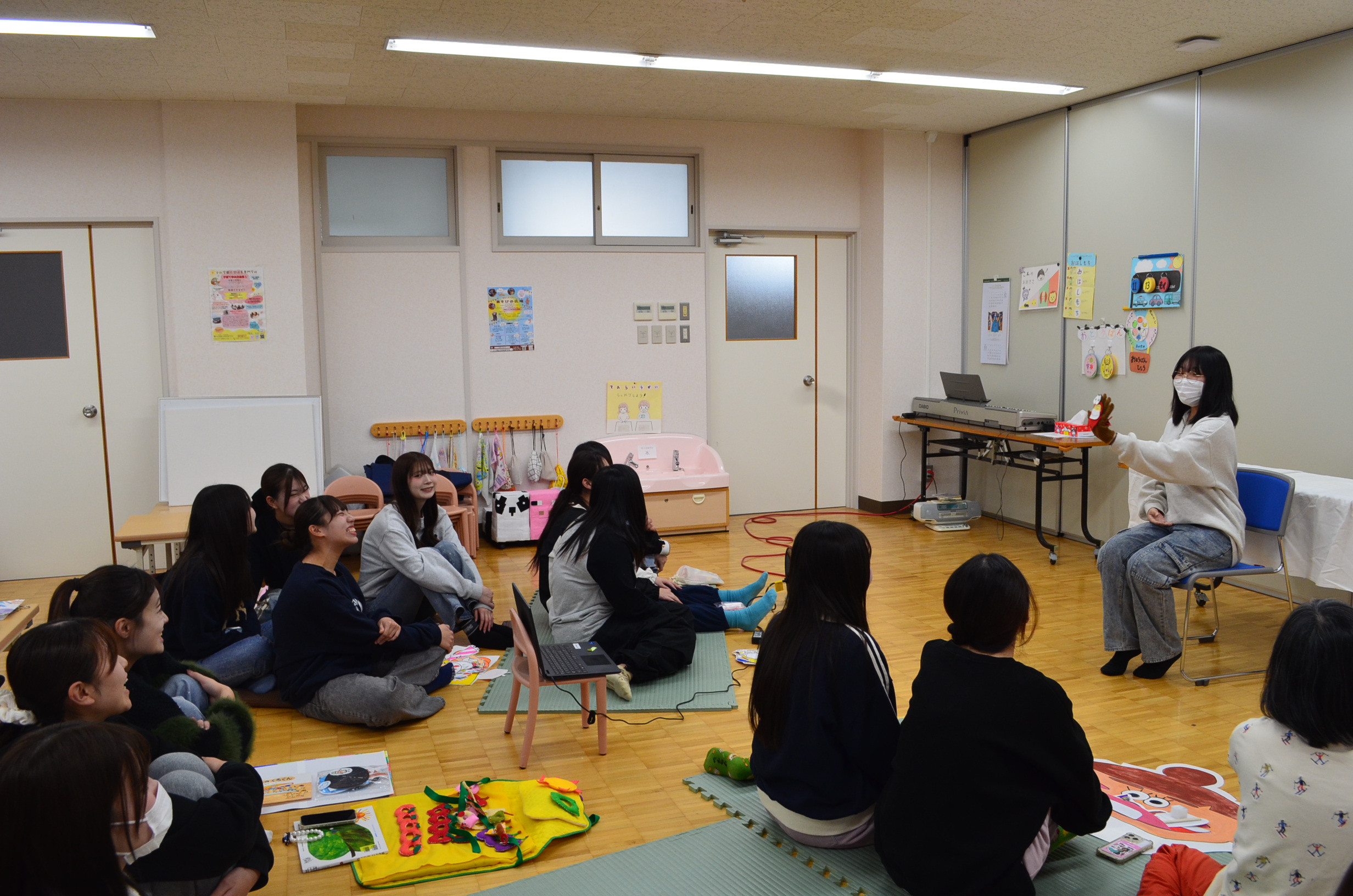 最後には模擬保育室にて全員で実演発表をしました。発表する際には自分の作品が何歳児さん向けの作品なのかを伝えてから実演します。可愛らしく、更には面白く工夫された作品が多くありました。また歌や演技も個々の個性が光り、2年間の学生生活で得た「実践する力」を大いに感じる時間となりました。