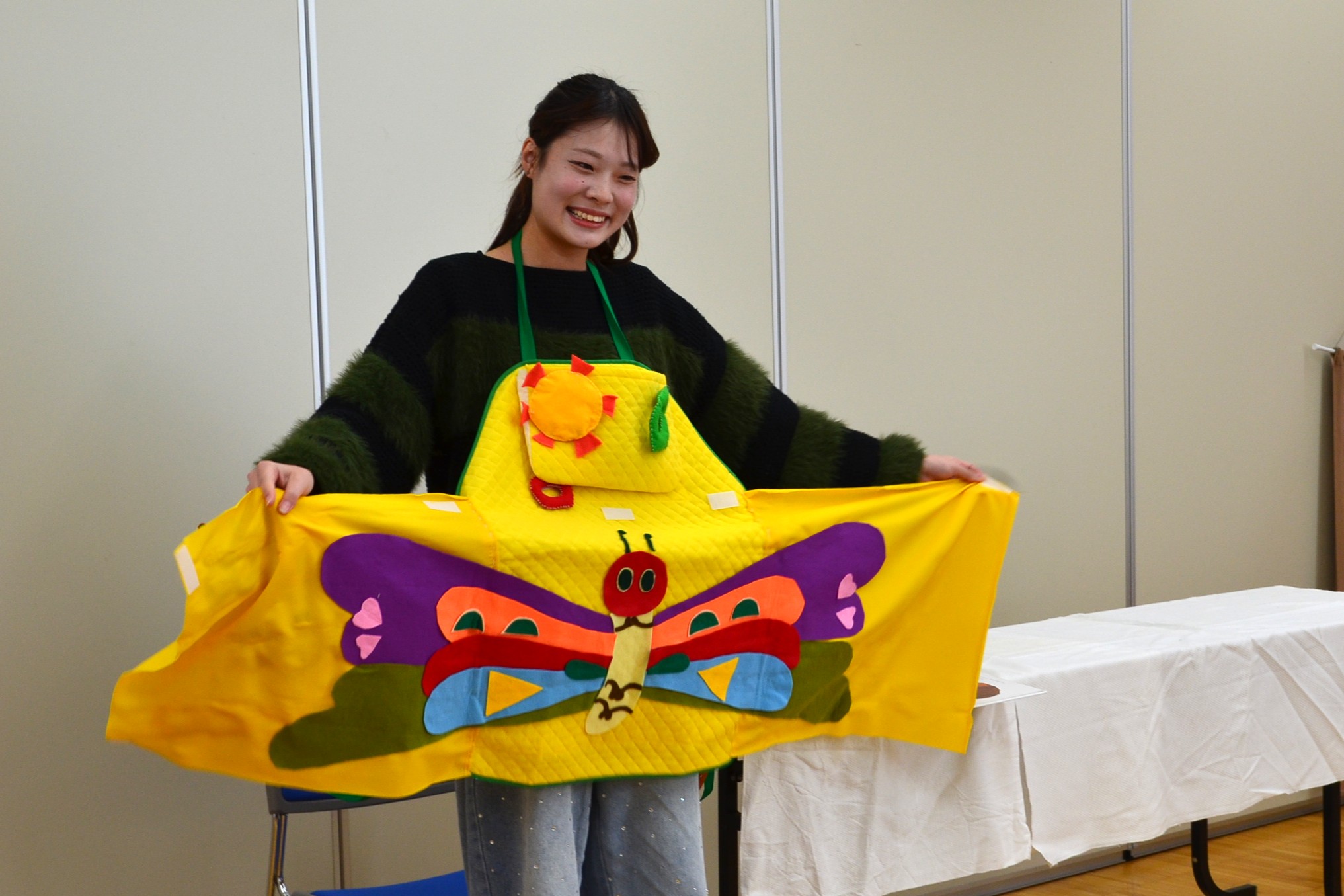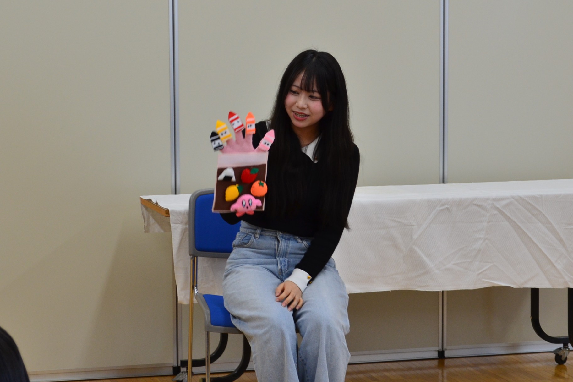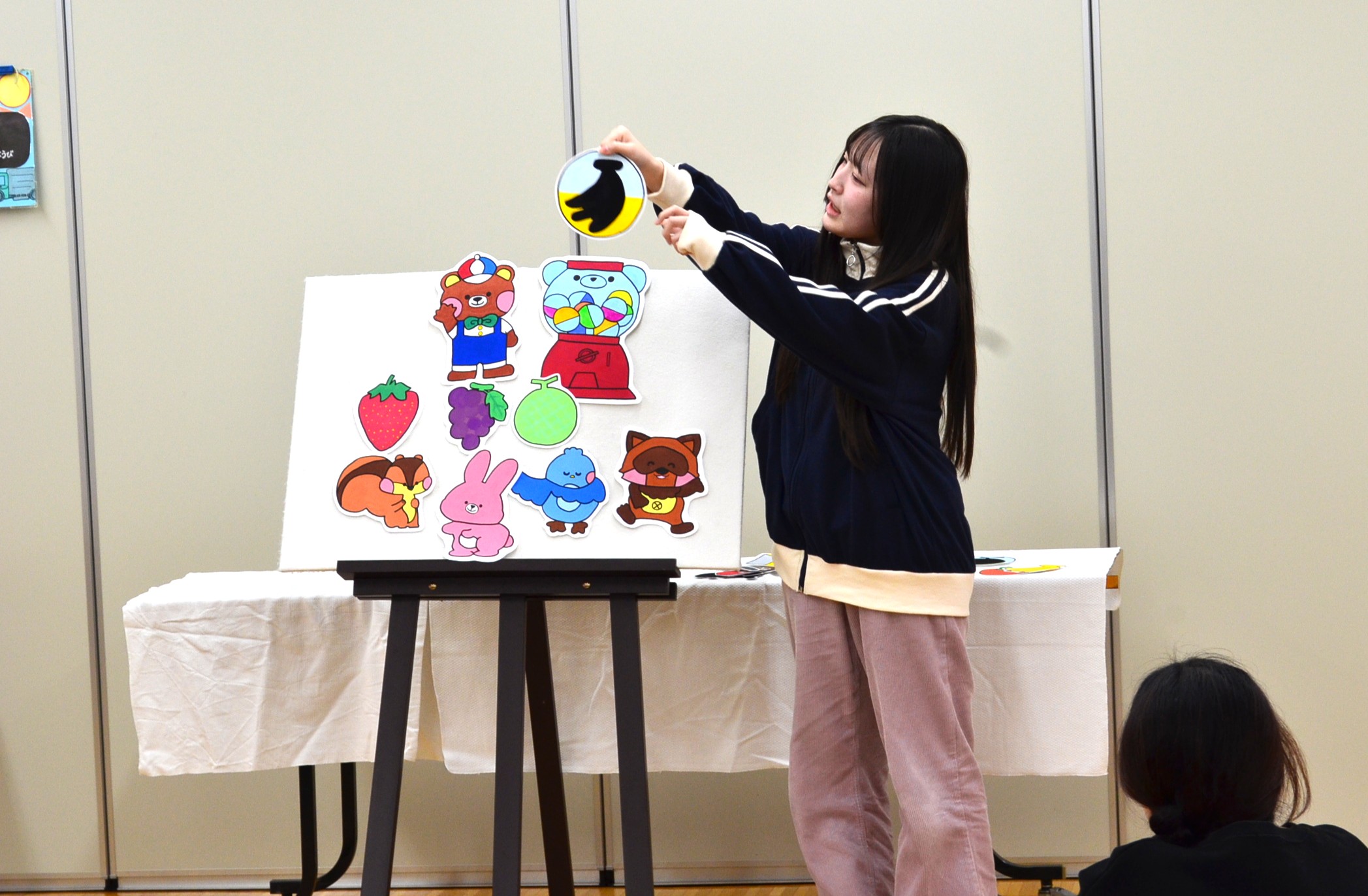 最後には模擬保育室にて全員で実演発表をしました。発表する際には自分の作品が何歳児さん向けの作品なのかを伝えてから実演します。可愛らしく、更には面白く工夫された作品が多くありました。また歌や演技も個々の個性が光り、2年間の学生生活で得た「実践する力」を大いに感じる時間となりました。